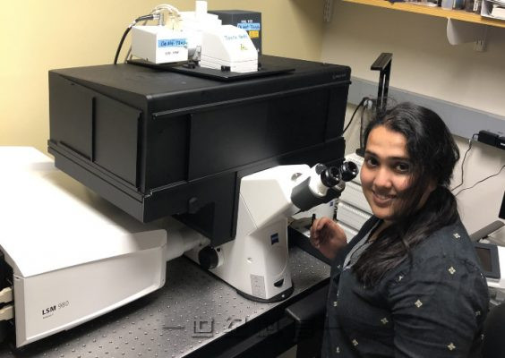 Nikhila Krishnan,博士 生物学专业的学生,使用新的蔡司 LSM980 共聚焦显微镜。这台最先进的显微镜位于布拉特生物成像中心,得益于美国国立卫生研究院的 S10 资助。